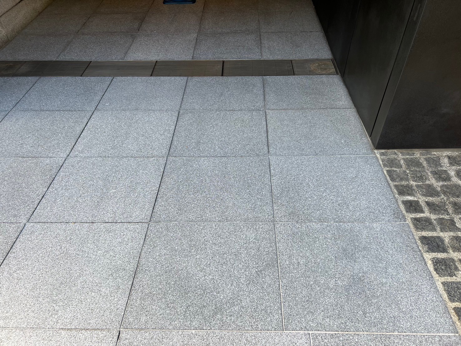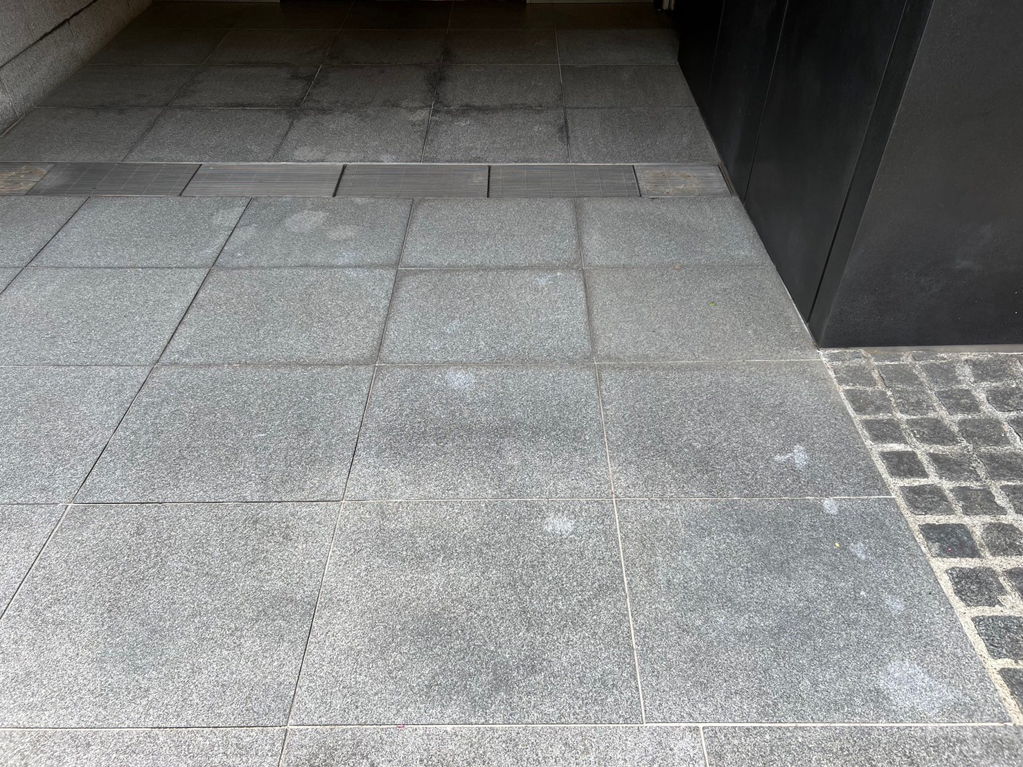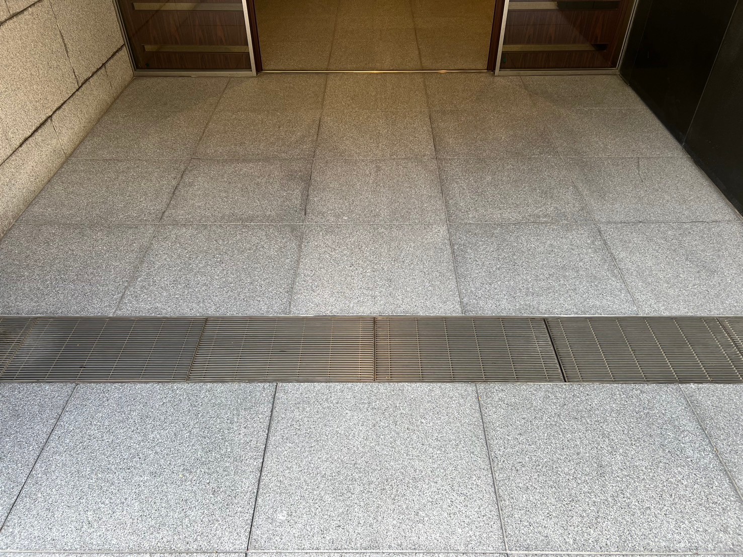 エントランスは屋外に面していることが多く、雨水や清掃時の水分が御影石に浸透することで水ジミが発生します。