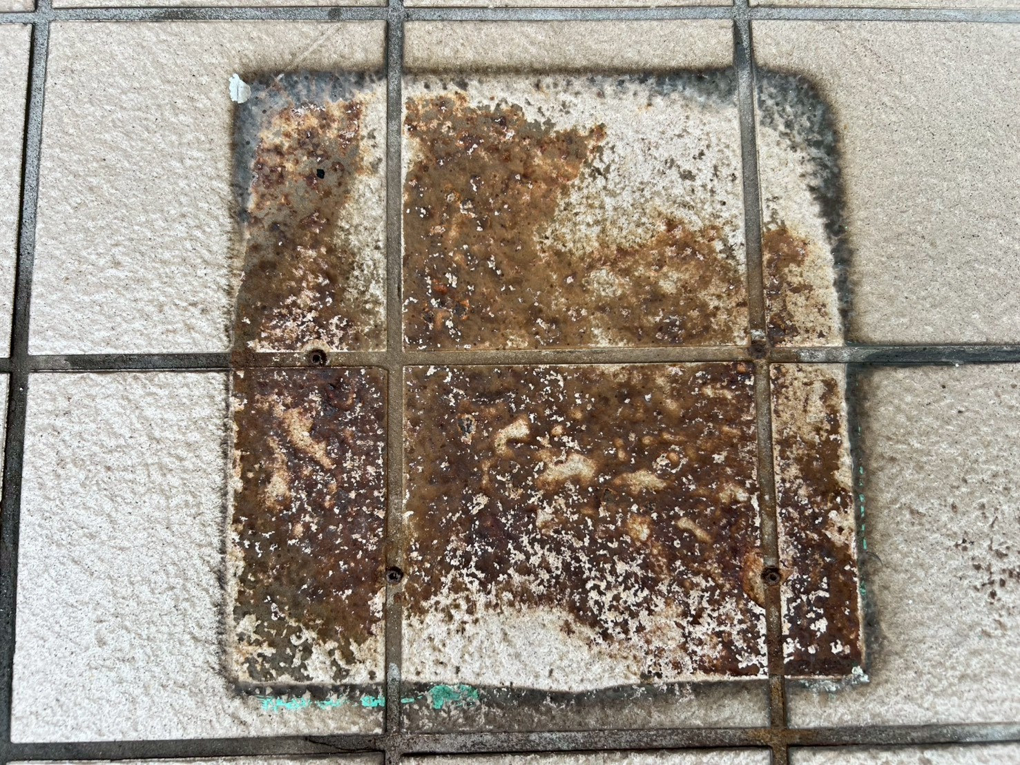 タイル全体にサビが広がり、黒ずみや変色が目立つ状態でした。